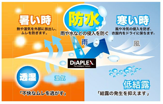 「モイスチャーバッファリング機能」により、水蒸気が水滴化する結露を防ぎ、常に衣服内をドライに保ちます。