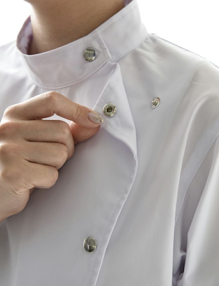 コートとしては薄手ですのでやや軽めの着心地感を得られ、生地のハリコシによりきちんと見えるメディカルタイプです。スタンドカラーと左身頃、共に金属ドットボタンがデザインポイント。メディカルらしさを感じさせます。薬局、美容、中食白衣と幅広く利用されています。抗菌防臭加工あり。7分袖。腰に左右ポケットあり、右のみペン刺し用ポケットあります。女性用。 |