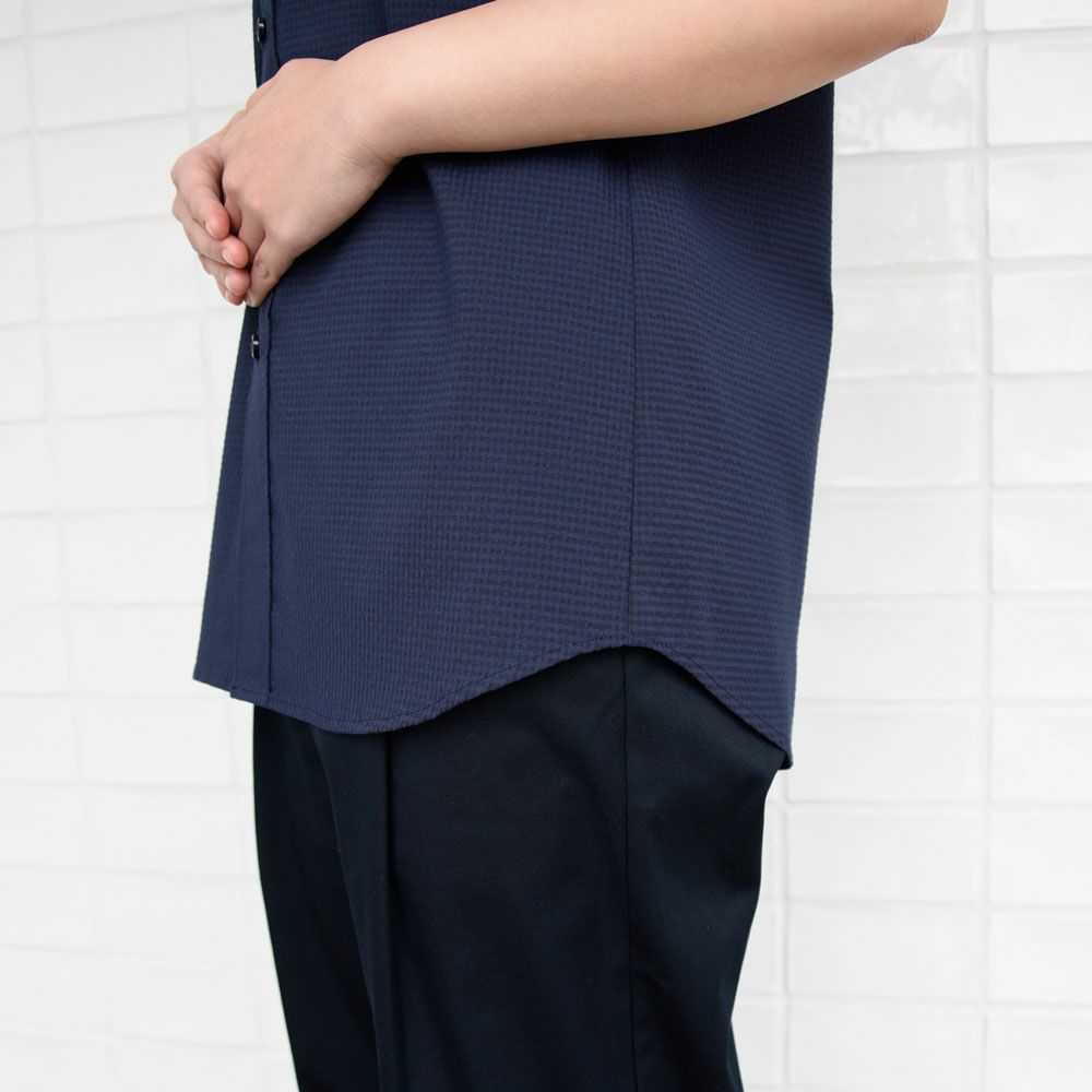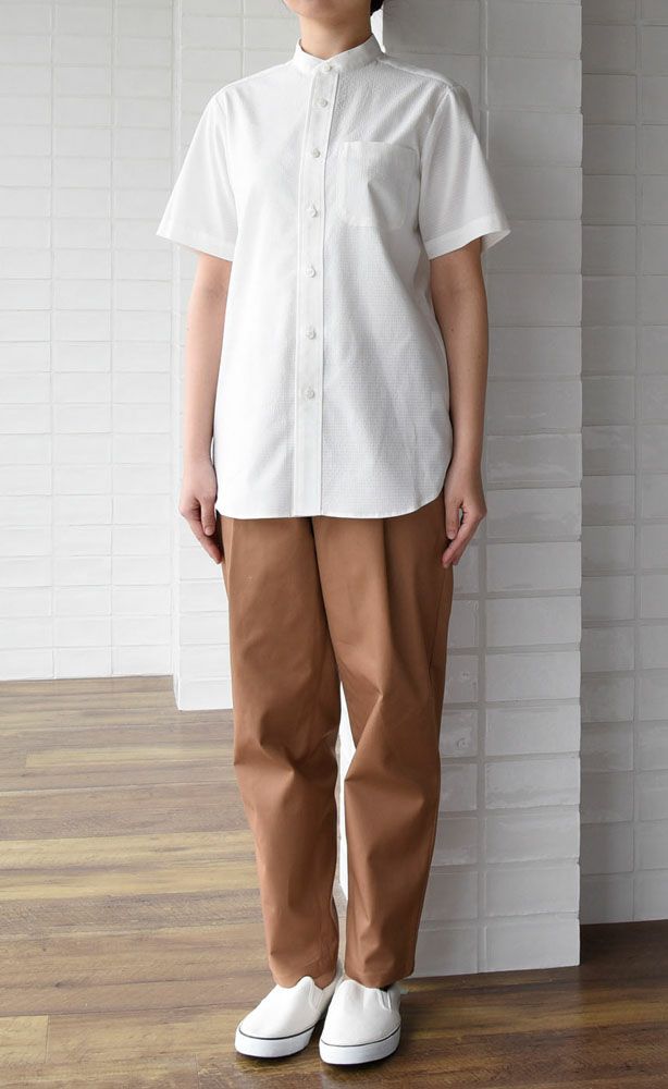 ニュースタンダードシャツとして開発されたスタンドカラー半袖シャツ。素材はシアサッカー、表面に凹凸があり肌離れが良く、涼しい素材です。カジュアルなシーンからレストランサービスまで使用できます。ユニフォームにありがちな大は小を兼ねるようなシルエットではなく、程よくフィットし、着用時の見え感はとても品格あるかたちになっています。ユニフォームに必要な胸ポケットは左にあります。わずかですがストレッチがあり着心地は快適です。ポリエステル50%入っているため洗濯耐久性も良いものになります。見た目、着心地共にとても綿リッチに感じるところも魅力です。アイロンをしっかりあてるとサッカー調の風合いが無くなりますので、低温で軽くあてるか、あてずに使用することをオススメします。 |
